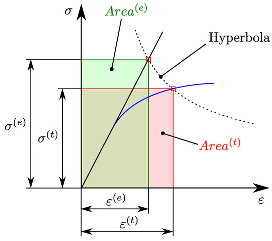 Equality of the linear–elastic and elastic–plastic areas in Figure 3 is achieved if the points and are connected by a hyperbola [69]. This condition is expressed by Equation (2), considering the stress concentration factor , the nominal stress S in the net cross-section of the notched component and the Young’s Modulus E [72].