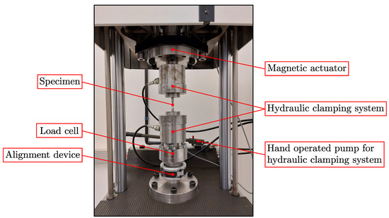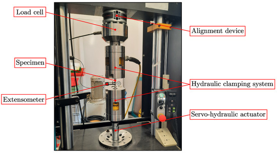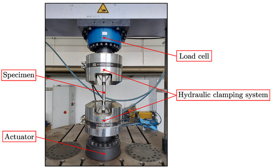 The high-cycle fatigue experiments were conducted on a RUMUL® Testronic 150 kN (Russenberger Prüfmaschinen AG, Neuhausen am Rheinfall, Switzerland) resonance test rig. The experimental setup is depicted in Figure 5.