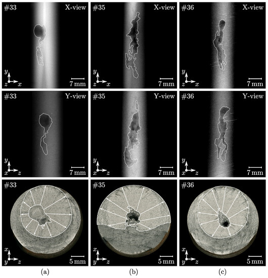 X-ray investigations in two perpendicular planes, denoted as X- and Y-view, were carried out prior to testing in order to characterize the spatial shape of each individual bulk defect. The obtained radiographs were evaluated in terms of the calculation of geometrical shape parameters which are given in Table 1.