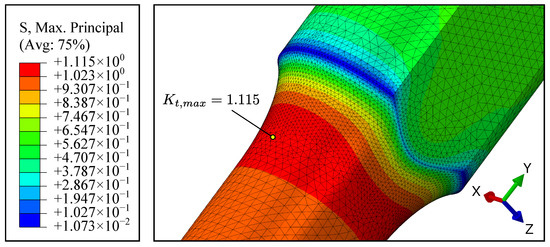 In order to ensure the surface defect as the site of fatigue crack initiation, a shape optimization study using Tosca® was conducted. The clamping conditions of the utilised test rig were modelled and the region around the clamping area was optimized aiming for a minimum stress concentration. Figure 12 depicts the result of the numerical study, revealing a maximum stress concentration factor of in the optimized specimen design.