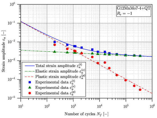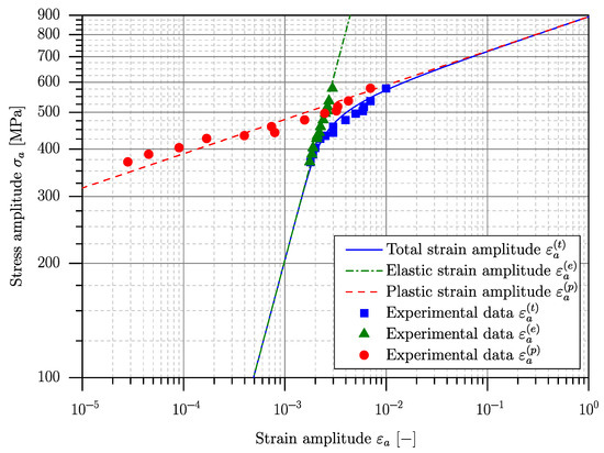The elastic strain amplitude is described by the fatigue strength coefficient , the stabilized cyclic Young’s Modulus and Basquin’s fatigue strength exponent b. The plastic strain amplitude is evaluated utilizing the fatigue ductility coefficient and Manson–Coffin’s fatigue ductility exponent c [90,92,93].