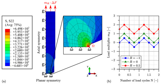 The low-cycle fatigue experiments reported in Section 2.1 are conducted utilizing the plain specimen geometry depicted in Figure 6. Hence, the description of the elastic–plastic strain as a function of stress according to Equation (4) is only valid for unnotched specimens, where the deformation behaviour is uniform in the loaded cross-section. As notched specimens exhibit a stress gradient emanating from the notch root, local plastic deformation can occur in the highly-stressed vicinity of the notch root, while elastic deformation is predominant in regions further away from it. Dealing with cyclic loading, this local plastic deformation results in effects such as mean stress relaxation in the notch vicinity, leading to a complex evolution of the acting stress field which cannot be described in an analytical manner. Thus, numerical analyses are necessary utilizing a proper material model capable of describing the inelastic material behaviour.