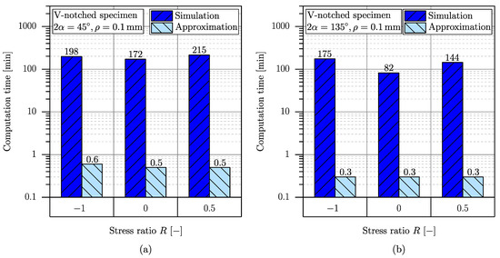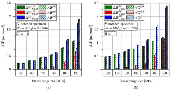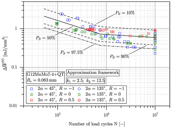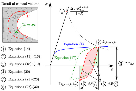 The total strain energy density concept was successfully applied to calculate the fatigue life of unnotched and notched components made of various materials under uniaxial and multiaxial loading conditions [64,65,66,67,68]. However, as an analytical calculation of is only reported for unnotched specimens [43], the assessment procedure generally relies on numerical methods. Due to the non-linear material behaviour, computational efforts significantly rise, especially if the load history changes the hysteresis loop severely until stabilization.