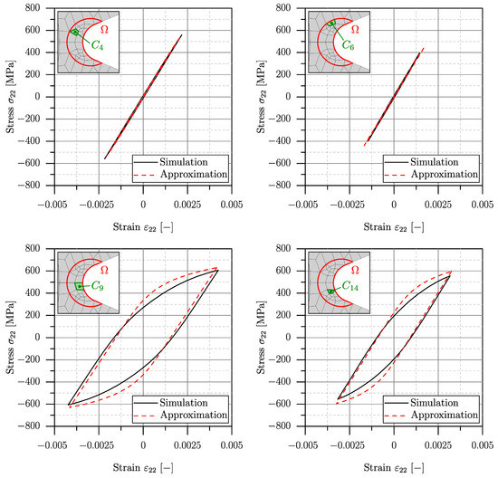 Defect structures such as shrinkage porosity networks induce a locally acting multiaxial stress state. Due to the ductile material behaviour of cast steel alloys, the resulting local loading conditions cause elastic–plastic deformation in the vicinity of each imperfection. Considering cyclic loading of notched or defect-afflicted parts, the non-linear material response results in mean stress relaxation [21,22,23,24] which alters the cyclic loading hysteresis until stabilization of the material behaviour. This stabilization process leads to the formation of a local effective stress ratio , similar to the case of residual stresses that interact with stresses induced by external loading [25,26]. In order to consider non-linear deformations during finite element analysis, the constitutive material equation provides the connection between strains and stresses [27]. Several elastic–plastic models are reported in the literature to include plasticity effects during cyclic loading such as Bauschinger’s effect or ratcheting [28,29]. A common constitutive model to describe the inelastic behaviour of metallic materials is given by Chaboche [30]. The approach presents a combined hardening model which considers isotropic as well as non-linear kinematic hardening and is therefore capable of describing the evolution of size and position of the yield surface in the space of stresses. The evaluation of the applicable constitutive model parameters is a well-researched topic and comprehensively published [31,32,33,34,35]. The application of combined hardening material models covers a broad variety of advanced research topics such as creep-fatigue analysis at elevated temperatures or uni- to multiaxial loading conditions in static and dynamic structural integrity analysis [36,37,38,39].