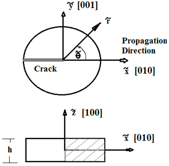 Schematic of the top half of an orthorhombic mono-crystalline plate weakened by a (001) [100] through-thickness crack initially propagating in [010] direction.