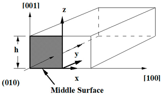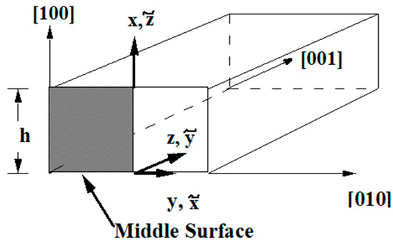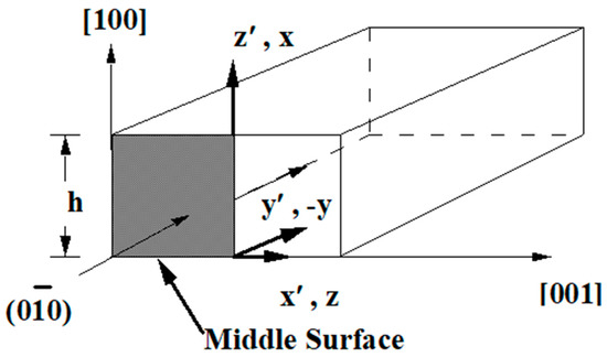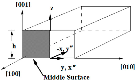 One of the most important cleavage systems for mono-crystalline orthorhombic YBCO is (001) [100] × [010] ({crack plane}<crack front>x<initial propagation direction>). In what follows, the deformation behavior in the vicinity of the front of a semi-infinite through-thickness crack, weakening an infinite orthorhombic YBCO plate of thickness, 2 h (Figure 1 and Figure 2) is analyzed in detail. Here, the -axis is placed along the straight crack front, [100], while the coordinates [010], [001] are used to define the directions along the length of the crack (propagation direction) and the direction transverse to it, respectively, in the middle plane of the single crystal plate. , and represent the components of the displacements in [010], [001] and [100] directions, respectively. The corresponding stress-strain relations are given as follows: