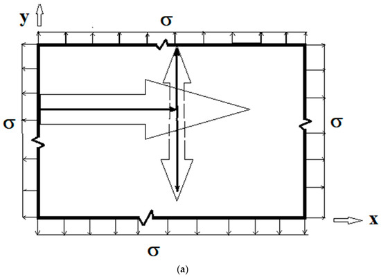 Out of the various combinations, such as (a′, b′, c′), (a, b, c), (a′, b, c), (a, b′, c), (a, b, c′), (a′, b′, c), (a′, b, c′), and (a, b′, c′), only the first two groupings can produce meaningful solutions, for the mode I/II and mode III loading cases, respectively. This step permits the separation of mode III from modes I/II. The first grouping is described below, while the second one has already been employed for the anti-plane shear case [59,60,61].