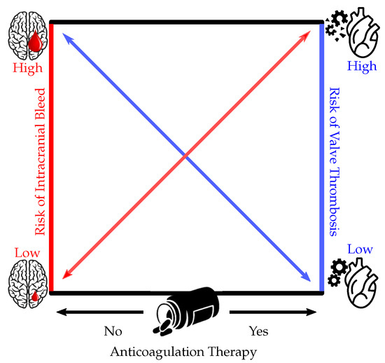 Intracranial hemorrhage in the setting of mechanical heart valves is a situation complicated by the opposing natures of the problems. An ICH is a situation in which bleeding in the brain would benefit from coagulation and clotting of the bleeding [153]. Mechanical heart valves are the opposite; they create a prothrombotic state, and therapy is geared toward preventing valve thrombosis so that an embolism does not occur elsewhere in the body. The lack of evidence and guidelines further complicate the issue [154]. In a cross-sectional study administered to neurologists and neurosurgeons, Alkherayf et al. concluded that a wide variation existed in the approaches of patients with mechanical heart valves with ICH, likely influenced by patient and valve-related factors [155]. Romualdi et al. concluded that stopping anticoagulant therapy for as much as fourteen days is safe in the setting of ICH with a mechanical heart valve [156]. In a review of thirty-nine patients’ cases of ICH with mechanical heart valves, Wijdicks et al. similarly concluded that temporary interruption of anticoagulants for up to two weeks is safe in patients without prior history of embolic events [157]. In a case report, Shah et al. withheld warfarin in a patient with ICH and mechanical heart valves while the patient underwent a decompressive craniotomy. The medical team resumed anticoagulation five days postoperatively and the patient remained well on discharge and suffered no acute events in 12 weeks of monitoring [158]. In a review, Flaherty et al. conclude that compared to other patients with ICH, those on anticoagulation are at greater risk of hematoma expansion and thus should have their anticoagulation reversed [159]. In a retrospective cohort study, Kuramatsu et al. found that the reversal of anticoagulation within 4 h of ICH was associated with lower rates of hematoma expansion [160]. In a retrospective series, Bashline et al. analyzed 63 patients with ICH and mechanical heart valves and concluded that withholding anticoagulation for at least ten days was not associated with any thrombotic events due to valve thrombosis [161]. Colantino et al. also cite hematoma expansion as the greatest risk to continuing anticoagulants with an ICH and recommend that anticoagulants not be considered for the first twenty-four hours after an ICH [162].