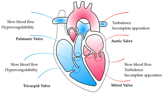 There are many complications that can arise from artificial heart valves. These complications include infection, hemolysis, and thromboembolism. Thromboembolism, as mentioned previously, is managed with anticoagulation therapy and will be discussed further in this paper. Some potential hemostatic and hemodynamic factors involved in the development of prosthetic valve thrombosis are summarized in Figure 2 by anatomical location. Infective endocarditis is a very common complication following valve replacement. The most common organism to infect prosthetic valves is Staphylococcus aureus [67,68,69]. Methicillin-resistant Staphylococcus aureus has been associated with an increase in the mortality rate for patients following prosthetic valve replacement. Management of this complication includes antibiotic therapy with vancomycin and rifampin. The use of aminoglycosides can also promote sustained susceptibility to rifampin [70,71,72]. Another complication of prosthetic heart valve replacement is hemolysis, which is usually secondary to structural deterioration of the valve, mechanical trauma to red blood cells, and leakage of fluid [73]. Patients with this complication may present with fatigue, jaundice, and dark urine. Treatment involves iron and folate supplementation and transfusions if necessary. Beta-blockers have also been seen to decrease the extent of hemolysis [74]. Patients presenting with paravalvular regurgitation would most likely require surgical intervention to treat the anemia [73]. Mitral stenosis causes a decrease in effective ventricular filling and systolic dysfunction of the left ventricle, eventually leading to heart failure and death. Artificial mitral valve replacement is considered for patients with symptomatic severe mitral stenosis who either cannot tolerate percutaneous balloon valvuloplasty or have undergone unsuccessful therapy [75]. Similar to aortic stenosis, patients with chronic mitral stenosis tend to be older and have a higher incidence of concomitant diseases such as coronary artery disease and diabetes [76,77]. Patients undergoing mitral valve replacement are typically placed on dual antiplatelet therapy to prevent thromboembolic events [78]. The most common complications associated with this surgery are thromboembolism and acute kidney injury [79]. Other complications include hemodynamic instability after discharge from the hospital, recurrent mitral stenosis, infection at the surgical site, abnormal heart rhythm, paravalvular leak, death, stroke, and heart attack. Treatment of these complications varies depending on the cause and may include antibiotics, blood products, anticoagulation therapy, and diuretics. Prognosis varies based on the underlying cause of the disease and the severity of symptoms prior to surgery.