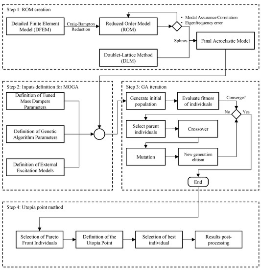 The framework is divided into four steps, as depicted in Figure 1. The first step consists essentially of the creation of the ROM from the detailed finite element model, by using the CBRM, which can be coupled with the aerodynamic linearization DLM by using the spline theory, generating the final aeroelastic model to be used in the optimization iterations. The second step consists of the utilization of the developed ROM to place and tune the TMD devices and apply the external excitation and boundary conditions. Through the definition of the genetic algorithm parameters, such as crossover and mutation strategies, the elitist multi-objective iterations are defined. The select genetic operators play a critical role in improving the fitness of individuals in each generation of the genetic algorithm. These operators ensure that successful characteristics are effectively transmitted to subsequent generations and introduce genetic variability into the population. Crossover is a probabilistic process where two parent individuals are selected from the population and their genetic material is combined to generate new offspring. The specific crossover method used in the implementation is the fully random crossover, although other crossover methods exist within the literature. Mutation, another genetic operator, introduces further genetic variability by randomly changing the genetic material of one or more individuals within the population. The adaptive mutation method is implemented within the presented optimization framework, which adjusts the mutation rate based on the fitness ranking of individuals. Individuals with lower fitness receive a higher mutation rate, while those with higher fitness have a lower mutation rate. Further details about adaptive mutation are discussed in the work from Libelli and Alba [34]. The third step corresponds to the elitist multi-objective genetic algorithm iterations, which are responsible for determining the best parameter set of the TMD that concurrently minimizes the aeroelastic response and the mass inclusion in the structure. During the optimization procedure, the iterative process of the genetic algorithm continues until the convergence criteria is met. The specified criteria include exceeding the maximum number of specified generations or achieving an average change in the spread of the Pareto front that is below a specified tolerance. Specifically, the latter criterion states that the convergence criterion is met when the spread of the Pareto front exhibits minimal changes and the final spread value is less than the average of the recent spreads. Finally, the fourth step of the multi-objective optimization method determines several sets of feasible optimal solutions according to the constraints defined; however, only a smaller set of solutions can be implemented at a time for a structure. Therefore, to quantitatively determine the best design variables set among the Pareto front points, the utopian point method was used [35]. The utopian point can be found by means of the coordinates of the extremities of the Pareto front, thus defined by values that simultaneously minimize both objective functions. The described method can be formulated to measure the distance between an individual located at the pareto Front, , and the ideal point, , as