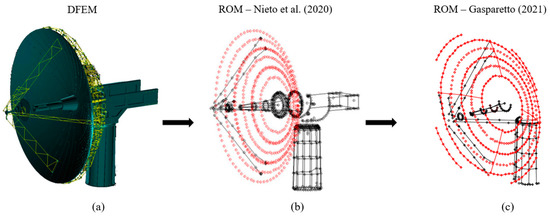 InterTronic Solutions 12 m VLBI antenna FE ROM evolution. (a) The DFEM provided by the industrial partner, (b) The initial ROM created by Nieto et al. [42]. (c) The further reduced ROM implemented within this optimization framework [38].