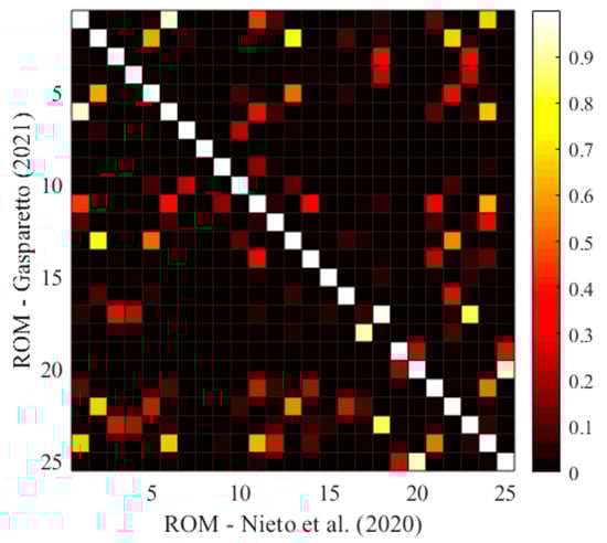 In order to evaluate the correlation between the mode shapes of the ROMs considered, the MAC is utilized to compare the first 25 eigen vectors and indicate the consistency of the solution. The MAC is given in Equation (6), where is the r-th mode shape of the ROM developed by Nieto et al. [42] and is the s-th mode shape of the ROM implemented in this work.
