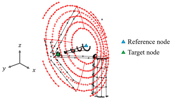 As shown in Figure 5, the pointing accuracy of the antenna is assessed by means of a geometrical analysis considering the deviation angle of a reference node, which is located at an imaginary static point at the center of the primary reflector, with respect to a target node, which is defined at the center of the secondary reflector. The fixed distance between the two defined monitoring nodes is measured as and is used throughout the analysis. The set of the following equations presents the computation of the pointing accuracy of the antenna structure: