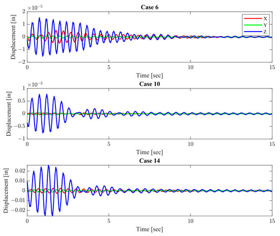 The PSD displacement function and the time–response displacement of the selected target node are given in Figure 6 and Figure 7, respectively, where the operational cases 6, 10, and 14 are chosen to illustrate the behavior of the structure under the dynamic excitations. The output of the rotational DOF was omitted from the results due to their negligible values when compared to the translational ones. Furthermore, the aeroelastic response to be presented herein is limited to the VLBI antenna modeled with a 0° azimuth angle. For different azimuth angles, the mass and stiffness distribution of the antenna changes, which will likely result in distinct responses in the frequency and time-domains.