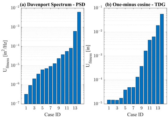 Comparison of the aeroelastic response fitness for the (a) PSD and (b) TDG gust models. The best individuals found from the optimization framework are evaluated among both gust models.