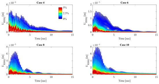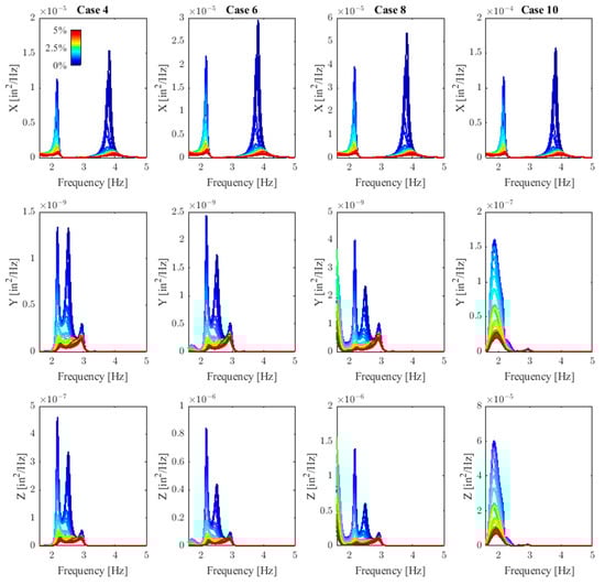 Concurrent aeroelastic response minimization using the STMD configuration for the operational cases 4, 6, 8, and 10 modeled with the DS. The PSD displacement functions of the target node are presented for each respective direction, where the color bar indicated represents the percentage of mass inclusion in the antenna.