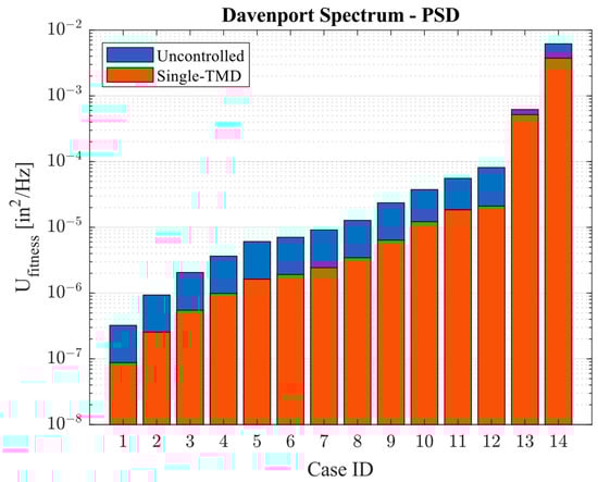 Aeroelastic response fitness function comparison between the uncontrolled and the controlled structure with an optimal STMD. Results presented for the Davenport Spectrum model.