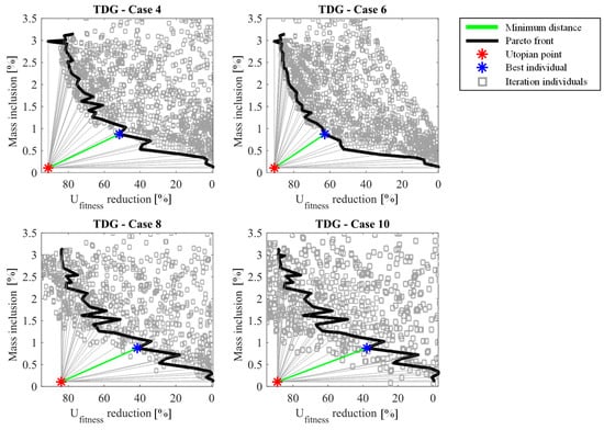 where is the calculated minimum utopian metric between the utopian point, , and the Pareto front point, , with a total of objectives. The exponent essentially defines the degree of the utopian metric and can vary from 1 to +∞, reflecting different penalty weighting for points that are located further away from the ideal point. In the case of the value of , the metric is defined by the standard Euclidean distance. The weights are defined as individual contributions originated from the objectives, representing a criterion of importance defined by the user [35]. An interesting in-depth discussion about the effects of metric weight selection is provided in the works of Lu and Anderson-Cook [35], Kasprzak and Lewis [36], and Szparaga et al. [37]. For simplicity of solution, in this paper, the weights are set as unitary values, such that the trade-off between objectives is equally balanced. For more details, in terms of mathematical formulation and algorithm description, the reader is referred to the work of Gasparetto et al. [38].