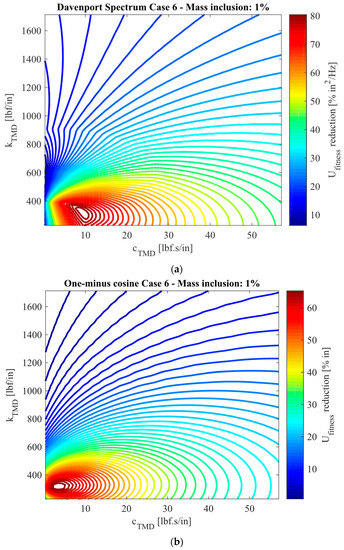 Factorial analysis of design variables considering a constant mass inclusion, for operational case 6. (a) Davenport Spectrum and (b) one-minus cosine gust models.