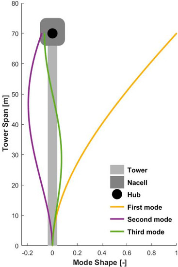To accurately model the wind turbine using the parameters mentioned earlier, it is essential to determine the most influential and dominant degree of freedom. This is achieved by analyzing the first three mode shapes of the tower system, as illustrated in Figure 1. By comparing the relative deflection values, it was observed that the first mode shape at the tip exhibits the highest deflection. In structural dynamics, the first natural frequency of a system is often considered a key indicator of its dynamic responses.