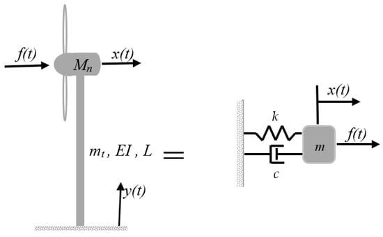 Based on these calculations, the wind turbine structure is represented as a single-degree-of-freedom system, as depicted in Figure 2, along with its corresponding equivalent model.