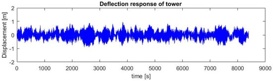 Then, using the time domain loads shown in Figure 5 as input forces to the structural system, the dynamic response of the structure was evaluated using the Newmark method. The resulting displacement response of the structure in the time domain is shown in Figure 6. This response was then transformed to the frequency domain to obtain the corresponding value in the frequency domain to verify the natural frequencies of the wind turbine structure.