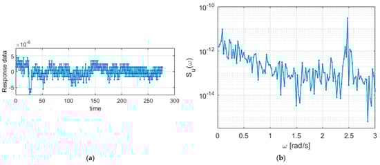 Meanwhile, the frequency response results of the simulations are illustrated in Figure 8. Specifically, Figure 8a displays the simulation result of the Newmark time response in the transformed frequency domain, while Figure 8b shows the result obtained through the direct frequency response method. Both figures present the power spectral density of the turbulent wind load and the structure, exhibiting similar characteristics. It is worth noting that, while the dynamic wind load’s peak frequency is observed at low frequencies close to zero, the natural frequency of the structure is approximately 2.45 rad/s in both cases. These findings align with the results obtained from the measured data, as presented in Figure 7.