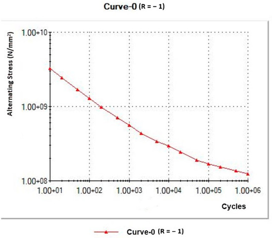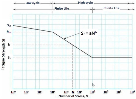 In the equation, σar represents the alternating stress in a completely reversed scenario, Nf represents the number of cycles or fatigue life, b represents the fatigue strength exponent representing the slope of the line, and represents the fatigue strength coefficient. When dealing with situations in which the specific parameters are not readily available, the equations serve as useful methods for estimating the high-cycle S-N line [24].