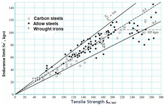 To find the endurance limit of a specific material, numerous fatigue tests are conducted at progressively lower stress levels. By plotting the obtained endurance limit values against the ultimate strength for a considerable number of ferrous metals, a reasonably strong correlation can be observed, as depicted in Figure 2. The plot proves that the endurance limit typically falls within the range of 40 to 60% of the ultimate strength, particularly up to approximately 1378.95 MPa. Beyond this point, the scatter of data increases, and the slope of the correlation curve becomes less steep. By simplifying the findings presented in Figure 2, an estimation of the endurance limit for steels can be made [24].