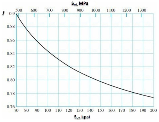 The next step in finding the fatigue line in the high-cycle region, which ranges from 103 to 106 cycles, involves estimating the fatigue strength, which is denoted as fSut, at 103 cycles. Several references have reached a consensus on using a value of f equal to 0.9 [25,26,27,28]. However, some researchers, upon considering certain experimental data showing the need for a more cautious approach, opt for a lower value of f, specifically 0.8. Nonetheless, it has been seen that for steels, the value of f tends to be slightly lower for materials with higher strengths. To prove a correlation between f and Sut, a relationship has been developed based on the elastic strain line within the strain–life approach to fatigue analysis. This relationship, which is specific to steels, is graphically illustrated in Figure 3 and expressed through curve fit equations [24].
