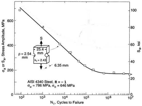 Therefore, when comparing S-N curves, as depicted in Figure 4, for a notched plate specimen, if the curves are plotted either as S (stress) or Kt × S (stress concentration factor multiplied by stress) against the number of cycles until failure, they will not align with the curves obtained via simple axial loading.