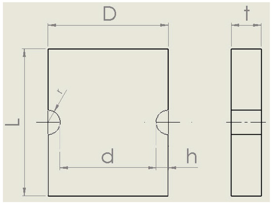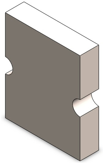 Figure 5 illustrates a rectangular plate specimen measuring 31 mm × 25.4 mm × 6.35 mm, featuring opposing semicircular notches. The purpose of this analysis is to examine the stress distribution in the plate surrounding the notches. The dimensions of the notches are considered while supporting a constant plate width and centre distance between the notches. The plate is subjected to a tensile load to ease stress evaluation.
