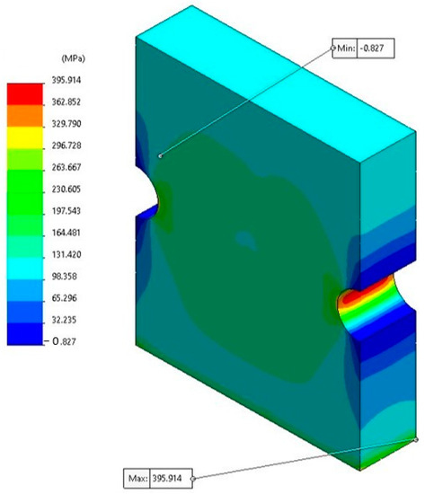 The conventional approach used to determine the nominal stress in a notched member involves dividing the axial load by the cross-sectional area measured at the specific notch position [30]. Assuming the axial load = 20,195 N, this relationship can be represented by the following expression: