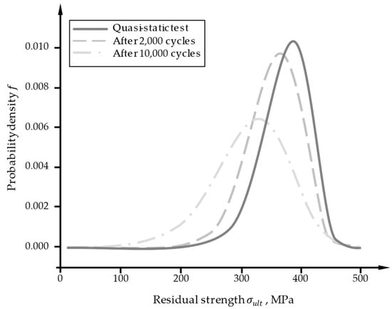 Thus, the measured residual strength, here in the static case, decreases after increasing fatigue damage induced, as Figure 2 shows []. Similar assessments has been published in [,,]. The characteristics of the fatigue behaviour are influenced by fibre orientation, test frequency, temperature [], or humidity [].