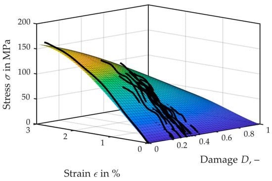Figure 4 additionally shows the comparison of the test curves with the simulated material behaviour, represented as a surface plot from sampling damage steps of 0.02. In the previous work of the authors, an approach could be created in this way, which, on the one hand, allows an estimation of the fatigue life and the fatigue damage and, on the other hand, a prediction of the corresponding material behaviour.
