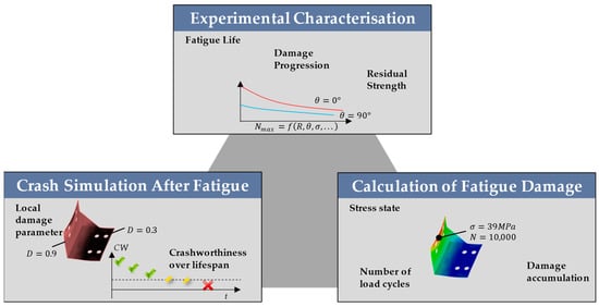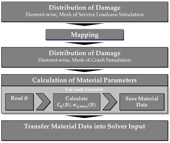 In this section, we explicate a process for taking material degradation into account when simulating crashes involving short fibre-reinforced thermoplastics. As illustrated in Figure 5, the calculation approach encompasses several key stages, starting with the experimental determination of characteristic values. In this step, it is necessary to conduct static, cyclic, and high velocity experiments to obtain information about the anisotropic stiffness and strength characteristics of the material under static and dynamic impact load applications. Additionally, cyclic experiments provide the necessary characteristic values for the direction-dependent fatigue strength and damage progression over the service life []. In the subsequent stage, damage distribution within the component in question is computed based on the stresses engendered from operational loads. Oftentimes, data regarding the stress conditions of the component is obtainable during product development through simulations to guarantee functionality during use. Based on these experimental findings, the damage distribution in the component can be calculated. This knowledge of material parameters can then be transferred to the following crash simulation, taking into account the predicted local damage state.