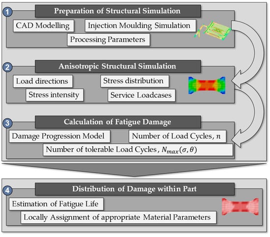 The steps to determine fatigue damage by simulation are sketched in Figure 6: understanding the distribution of a component’s fibres is crucial in preparing to simulate short fibre-reinforced components [], see step (1). To do so, simulating the injection moulding process and transferring the fibre orientation tensors [,] to the structural simulation is required. It is important to note that a mapping is necessary, as the meshing for the process simulation and the structural simulation differ. Generally, the process simulation is carried out with fine solid elements, so that several elements are available across the thickness. However, in structural and especially crash simulation, midplane meshes with shell elements are predominant. Thus, the fibre orientation tensors in the solid mesh of the process simulation are locally averaged and projected into the midplane. In this way, a material orientation is available for each shell element.