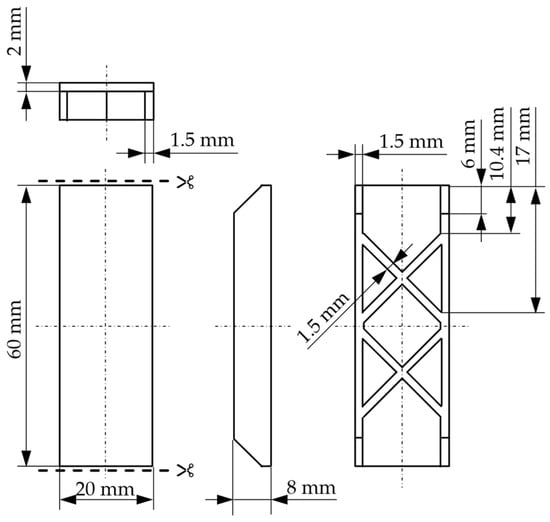 The cross-ribbed beams employed for the bending experiments are constructed from a U-shaped profile, which is strengthened in the middle by two X-shaped struts (“XX-Rib”) []. The design is modelled on that of parts such as front beams or licence plate carriers, which likewise feature cross-ribbing on their rear sections to enhance rigidity. Figure 8 displays the dimensions of the parts, which measure 60 mm in length, 20 mm in width, and 8 mm in height. On the one hand, the testability with standard tools in testing machines is ensured due to the relatively small dimensions, whereas, on the other hand, higher strain rates can be attained at moderate test speeds.