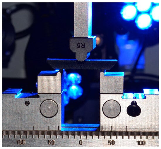 All tests on the XX-Rib are carried out as 3-point bending tests. The test setup is sketched in Figure 9: the XX-Rib is placed symmetrically on the supports with a radius of 2 mm and an inner distance of 33 mm. A bending fin with a radius of 5 mm penetrates the beam centrally from above. The force and depth of the bending fin’s penetration are measured.