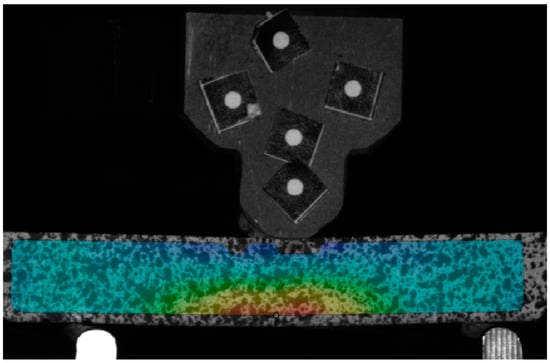 By linking the cyclic tests with the subsequent penetration test, the performance of a mechanically aged model is investigated. Based on the previously gained insights, non-destructive vibration tests are used to generate beams with deliberately induced pre-damage, which are then penetrated with elevated velocity for their remaining stiffness and residual strength. The cross-ribbed beam in the three-point bending test is loaded with a cyclic-repetitive force of 700 N at a load ratio of 0.1 and a frequency of 4 Hz in the service load case. This frequency ensures that no over proportional heating of the specimen occurs and is often found to be used in similar studies []. For the evaluation, Digital Image Correlation (DIC) is used [,,]. An image of the DIC evaluation is shown in Figure 10, where the penetration depth of the bending fin is determined by tracking dot marks. By analysing the speckle pattern on the front of the sample, the longitudinal strain of the sample is also determined, with compression on the top and elongation on the bottom.