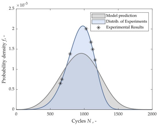 The distribution of the measured and predicted variables is shown in Figure 12, where the measured values for the listed probabilities of failure are entered as points. It can be seen that the model prediction predicts a wider scatter range. The probability density function is derived from the calibration of a Weibull distribution [,], which is very common in the modelling of cyclic tests and is used there as the distribution. All measured values lie within the prediction range of the model. It is worth mentioning here that the area under the graphs of the probability density functions is 1 in each case, therefore a wider prediction range results in a lower peak value of the probability density. Based on the described agreement between measurement and model prediction, the calculation of the maximum tolerable cycles can be considered valid. It is the basis for the following damage calculation.