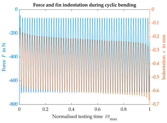 A good indicator of the loss of stiffness can be seen in Figure 13. It shows how the indentation of the bending fin increases over the test time despite the constant force limits of −70 N and −700 N.