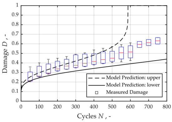 The damage determined in the test is compared with the model prediction for D5 (upper line) and D95 (lower line) in Figure 14. The measured damage is shown in the form of boxplots at intervals of 50 oscillations, with the extrema of the measured values entered as whiskers. The median of each measurement is shown as a red line. It lies between the limits of the model prediction for all considered numbers of oscillations.