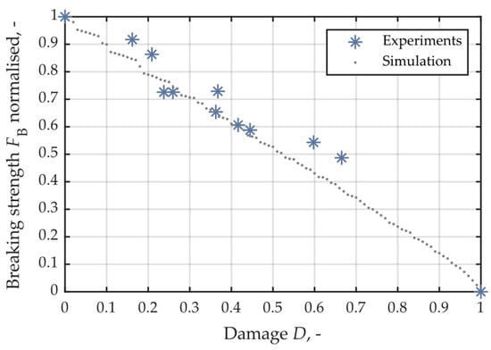To complete the scenario of an abrupt overload case after previous cyclic loading, the pre-damaged cross-rib beams are destroyed in a three-point bending test and the endured breaking force is determined-analogously; corresponding results are obtained from the simulation. In Figure 15, the determined normalised breaking forces are plotted against the damage; the expected trend in lower bearable forces with increasing damage is recognisable for both the experimentally and numerically determined results. All measured breaking forces are related to the average breaking force of an undamaged, virgin XXRib. This results in a value range that lies between 0 and 1. The results of the simulation model were calculated parametrically in steps of D = 0.02.