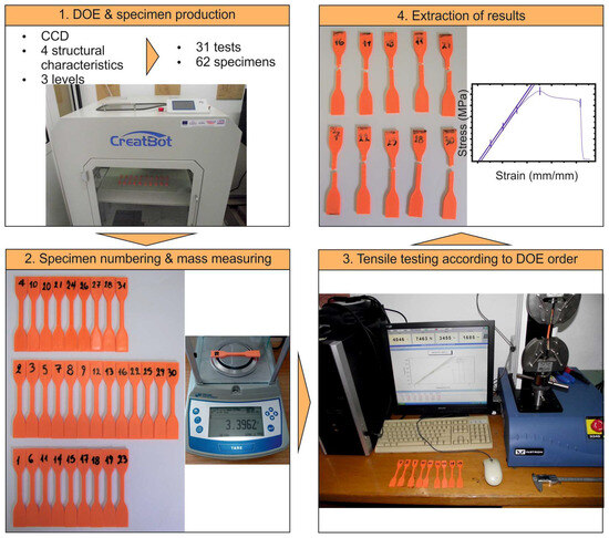 In the present study, the experimental workflow followed (Figure 1) includes the fabrication of the required tensile test specimens, design of the experiments and numbering of the parts according to the selected design, tensile testing, and gathering of the output data. The specimens used in the present study were fabricated with the aid of the CreatBot D600 Pro printer (Henan Creatbot Technology Limited, Zhengzhou, China), whereas the CAD model was prepared according to the features of the UltiMaker Cura 4.20 software (Ultimaker B.V., Geldermalsen, Netherlands). A total of 62 parts were produced according to the specifications generated by the CCD, which are discussed in Section 2.2, and the operation parameters are presented in Table 1. A preliminary study was conducted by testing a set of specimens with identical parameters. The purpose of the preliminary study was to gain insight regarding the influence of each factor, as well as to evaluate the testing method prior to the main experimental work. The specimens were fabricated by setting three factors to the middle values, and the fourth one to all levels, leading to 12 combinations.