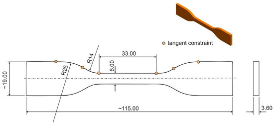 The specimens were designed with respect to the recommendations of the ASTM-D638 standard test method for the tensile properties of plastic parts [30]. Figure 2 illustrates the dimensions for the modelling of Type IV specimen, which has gauge length equal to 33 mm, 6 mm width and 3.6 mm thickness. The Instron 3345 universal testing machine (INSTRON, Norwood, MA, USA), loaded with a 5 kN cell, was utilized to carry out the tensile experiments on the 3D-printed parts.