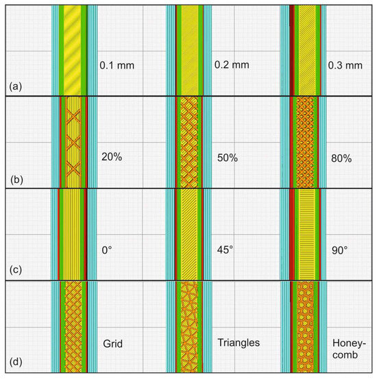 To determine the specifications of the test pieces, the experimental order and the combination of the conditions, a Box–Wilson CCD was implemented. The CCD is an experimental design for RSM, which can be either a full factorial or fractional factorial design with center points, enhanced with a group of axial points that can approximate the curvature of a process [31]. Moreover, it is considered ideal for the estimation of quadratic models during sequential experimentation. In the present study, the selected face-centered CCD corresponded to a full factorial design with 31 tests. Moreover, the tests were composed of 16 cube points, 7 center points and 8 axial points, in addition to the value of α, which is equal to 1. As presented by Table 2, the independent variables that constitute the input were: the LH, FD, LD, and FP, whereas the responses were the UTS and the S/M ratio. Therefore, the present work focuses on four structural characteristics at three levels each. The different variations of each parameter are shown in Figure 3: the LH (Figure 3a), FD (Figure 3b), LD (Figure 3c) and FP (Figure 3d). It is noted that the layer line direction corresponds to the top and bottom layers. The infill direction was kept as the default 45° angle for all builds.