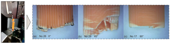 Before processing the output data, a set of magnified images of the specimens at the fracture point were taken. Figure 4 illustrates the three different fracture lines developed during the tensile testing according to the layer line direction. By observing Figure 4a, it is evident that the fracture line approximates a curve. However, the individual fractured layer lines indicate that they are perpendicular to the load. Moreover, this observation suggests that shearing is responsible for the weakening and, eventually, the fracturing of the lines, leading to the conclusion that the specific line direction allows for the delamination between layers. Similar findings were reported in [9], as well. Figure 4b indicates that due to the 45° layering, the fracture line follows a similar path, possibly causing the abruption of the layers. It is noted that the side layers forming the walls, which follow a perpendicular to the load pattern, fracture in a similar manner to the fracturing discussed in Figure 4a. Finally, Figure 4c illustrates the fracture line that developed on a specimen with layer lines deposited at 90°. Weakening marks (white areas) are evident on the side layer lines, which indicate that the load was applied perpendicular to the lines, as opposed to the central layer lines that did not fracture but rather were separated, possibly due to the bonding abruption. In addition, the preliminary results revealed that the best S/M ratio per factor was generated by the 0.3 mm layer thickness (7.12 MPa/g), 20% density (6.91 MPa/g), 0° layer line direction (7.15 MPa/g) and honeycomb pattern (6.74 MPa/g).