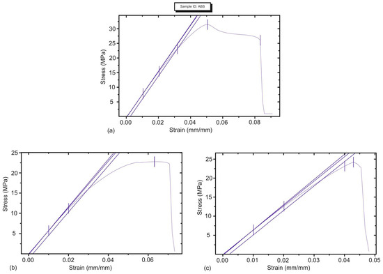 Regarding the direction of the top and bottom layer lines, it was found that it affected the generated stress–strain curve as well. A set of tests that belong to the preliminary study was carried out with specimens of identical parameters (LH = 0.1 mm, FD = 80% and FP = Grid), with the exception of the top/bottom line directions, to assess the generated curves. The 0° direction (Figure 5a) yielded a curve pattern that included the elastic area where the linear relationship between the stress and strain exists. Additionally, it was observed that the plastic area is larger compared to the ones generated by the 45° (Figure 5b) and 90° (Figure 5c) directions. In particular, the 90° layer line angle was responsible for the development of a much smaller plastic area and a rapid fracture point in comparison to the other orientations. Similar findings were mentioned in [19].