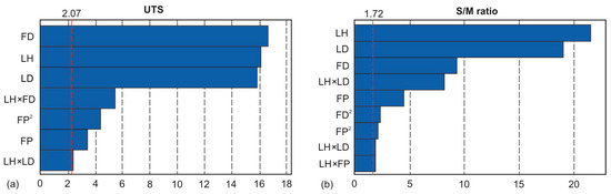 To further analyze the contribution of the factors, as well as to visualize the effects, the Pareto charts were plotted. Figure 6a displays the effects from the largest effect to the smallest, indicating that the FD, LH and LD contribute the most, with percentages equal to 32.31%, 30.38% and 29.43%, respectively. The magnitudes of the rest of the factors are considerably smaller; however, all terms are significant, as indicated by the reference lines (red dashed lines). Similarly, Figure 6b highlights the LH and LD as the most important effects, in addition to the FD and LH × LD, which exhibit weaker, but noticeable effects. The percentage levels of the aforementioned terms are 45.61%, 35.44%, 8.55%, and 6.64%, accordingly.